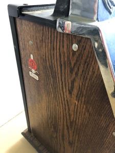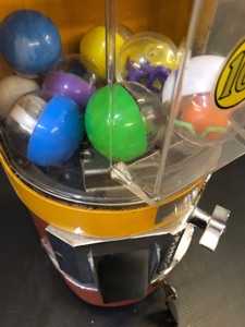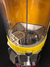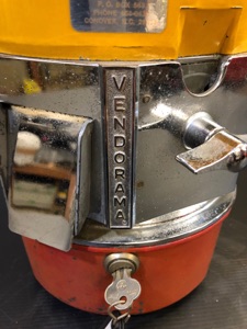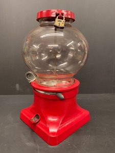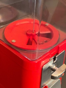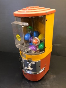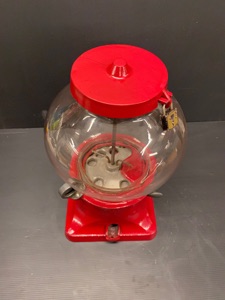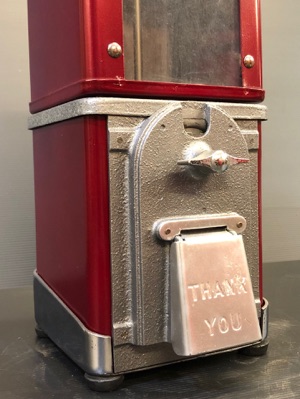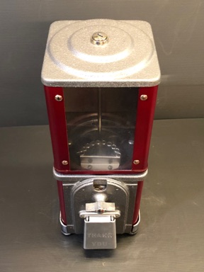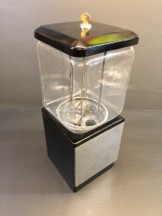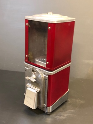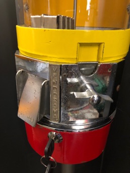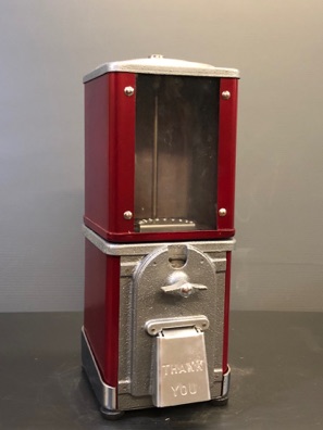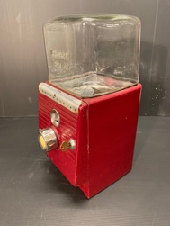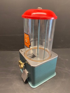 Probablement le plus étrange distributeur fabriqué par Northwestern Illinois USA avec sa forme de vieux juke box et son gros bouton . complet ici avec globe en verre embossé de la marque , 100% d’origine , avec sa clef , fonctionne avec des 5c us ou Euro
