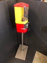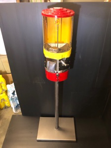 Distributeur de grosses boules de chewing gum , en parfait état d’origine , corps en acier et vitre bombée monté sur un tres beau pied ( pas d’origine mais qui s’accorde tres bien avec le distributeur ) fourni avec une nouvelle serrure