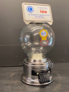 Distributeur de boules de chewing gum, ou boules surprise, globe polycarbonate avec élément debordant pour y mettre une publicité attractive, corps en métal et monnayeur chromé , fonctionne parfaitement , clé d’origine ,