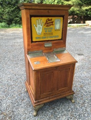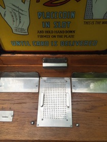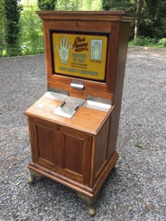 Amusant jeu de prediction , bonne aventure , lit mécaniquement vos lignes de la main avant de délivrer une carte de voyance , pour se faire une multitude de petites boules en acier «chatouillent» votre paume durant quelques secondes vous donant ainsi l’impression d’une lecture de vos lignes de main.La vitre s’eclaire lors de la lecture